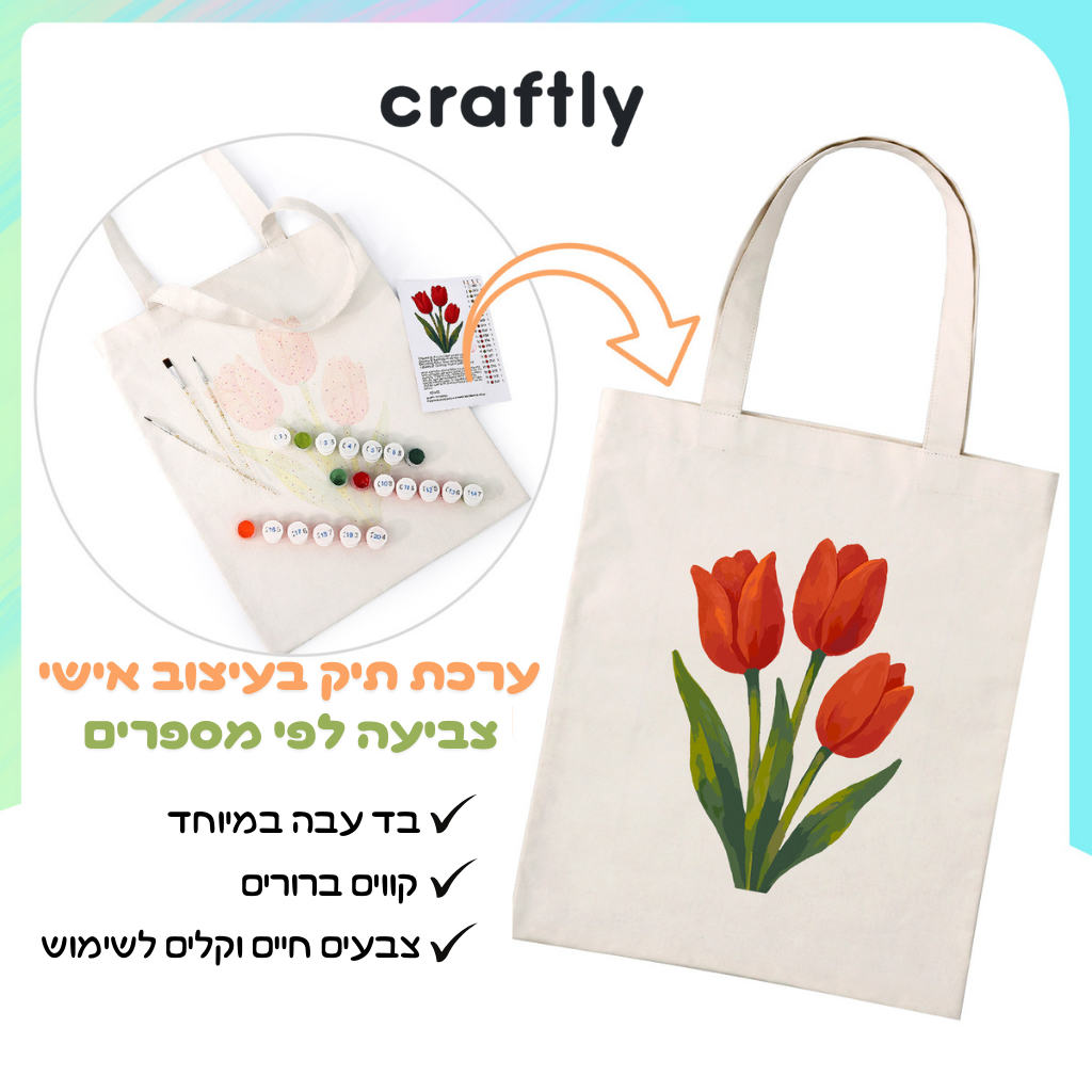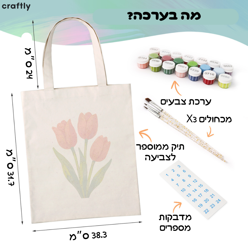 ✨ כל תיק DIY שלנו מאפשר לכם להפוך תיק רגיל לתיק בעיצוב אישי, תיק אמנותי, תיק יצירתי ותיק בעבודת יד – כזה שמביע את הסטייל שלכם, את הייחודיות שלכם ואת הרצון שלכם ליצור משהו אישי ומיוחד. אין כאן רק ציור על תיק – מדובר בתיק בעיצוב ייחודי שנוצר על ידכם עם צבעים ומספרים שמנחים אתכם שלב אחר שלב.